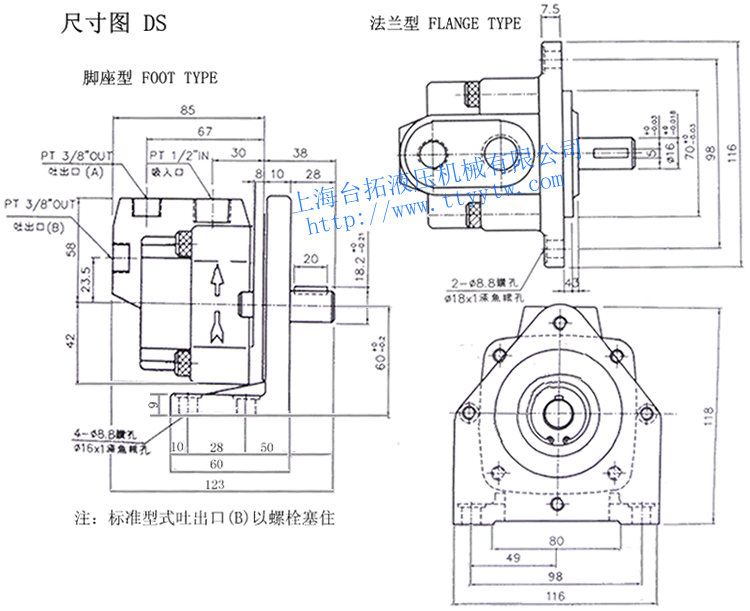 3、安裝定量葉片泵DS時推薦吸入濾油網(wǎng)使用100~150網(wǎng)目,口徑視定量葉片泵DS實際吐出量而定,裝配時須高于油槽底部5~10公分。