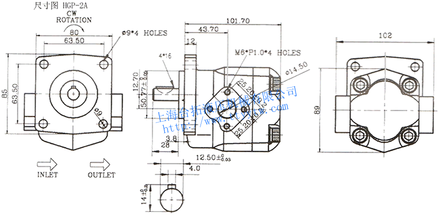 產品型號 吐出量cc/rev 壓力bar(psi) 轉速rpm 重量kg 工作 最高 Rate 最高 最低 HGP-2A-*2* 2 210(3000) 250(3500) 1800 5000 900 1.69 HGP-2A-*2.5* 2.5 850 1.70 HGP-2A*3* 3 1.70 HGP-2A-*4* 4 4500 800 1.71 HGP-2A-*5* 5 3500 700 1.71 HGP-2A-*6* 6 1.72 HGP-2A-*8* 7.5 3000 600 1.74 HGP-2A-*9* 9 2500 550 1.74 HGP-2A-*11* 10.5 2000 500 1.74 HGP-2A-*12* 12 175(2500) 210(3000) 1.76 定量齒輪泵HGP-2A系列尺寸圖