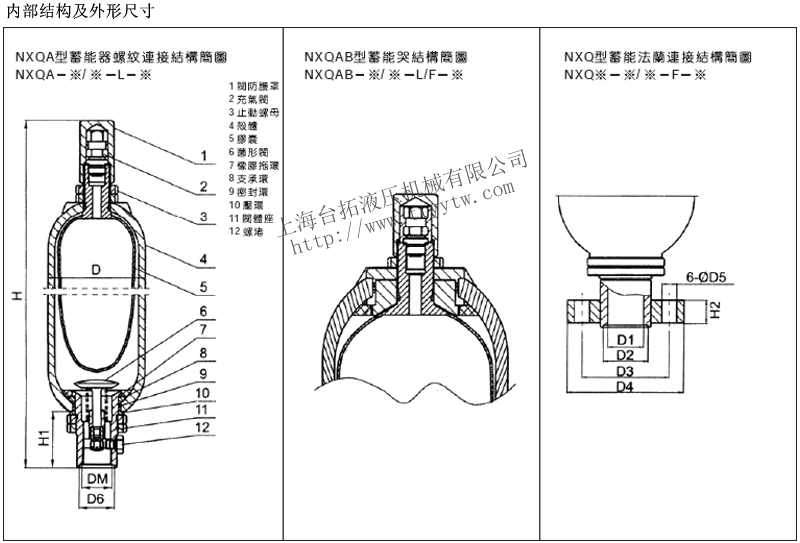 2、蓄能器NXQ系列膠囊式蓄能器由油液部分和帶有氣密隔離件的膠囊構成,位于膠囊周圍的油液與液壓回路相通。因此,當毅力升高時油液進入囊式蓄能器由此氣體被壓縮;當壓力下降時,壓縮氣體膨脹,進而將油液壓入回路。蓄能器NXQ系列內部結構及外形尺寸