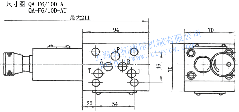 QA -F 6/ 10 D A U 系列號碼 公稱壓力 調整閥通徑 該閥所屬系列 安裝方式 元件進出口油路 出口節流 單向調速閥 20Mpa ?6 ?10 疊加式 A:A出口