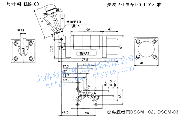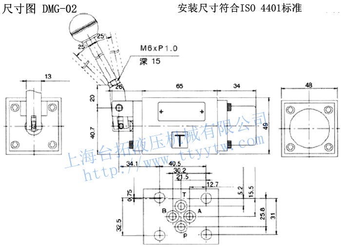 MPa重量 kg 管式 板式 管式 板式 管式 板式 - DMG-02 - 30 25 2 - 1.5 DMT-03 DMG-03 50 50 10 4.5 3.7 DMT-04 - 100 - 14 7.6 - DMT-06 - 180 - 13 - DMT-10 - 300 - 22 - 備注:1、現(xiàn)成規(guī)格閥心為2B2、3C2、3C3、3C4、3C6,若有特殊規(guī)格,請(qǐng)聯(lián)系上海臺(tái)拓液壓技術(shù)部。2、3C3、3C6中間位置之最大流量較小,容許背壓亦小。3、背壓高于7MPa時(shí),請(qǐng)直接將泄油口接回油箱。4、手動(dòng)桿力矩,隨容許背壓改變。